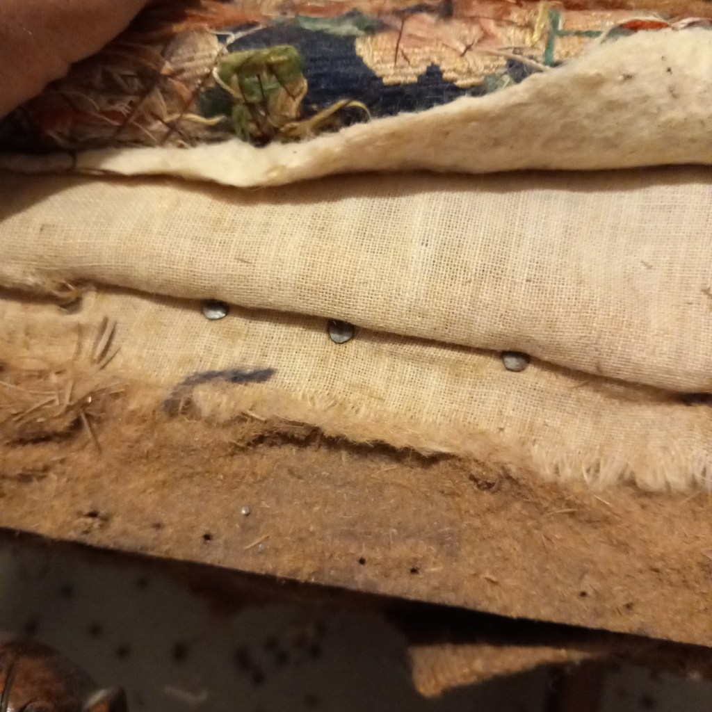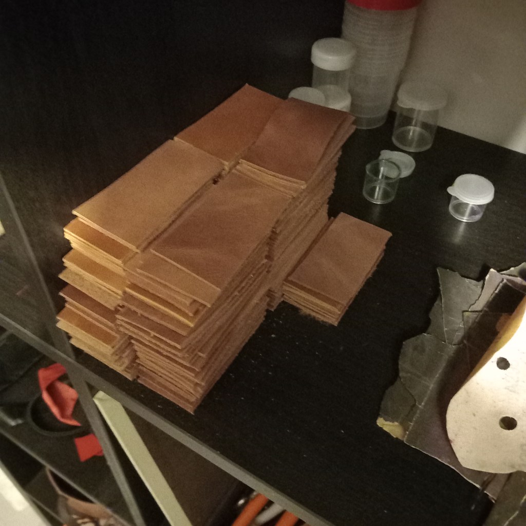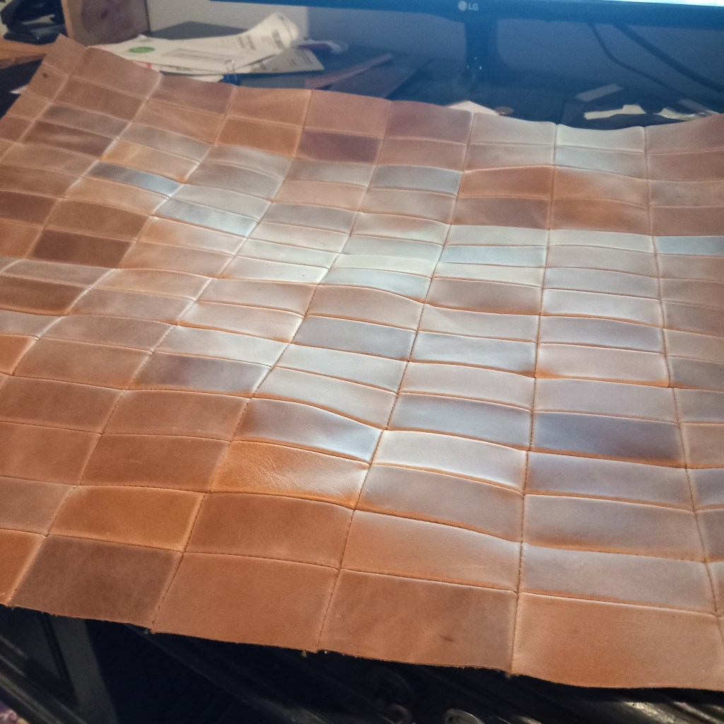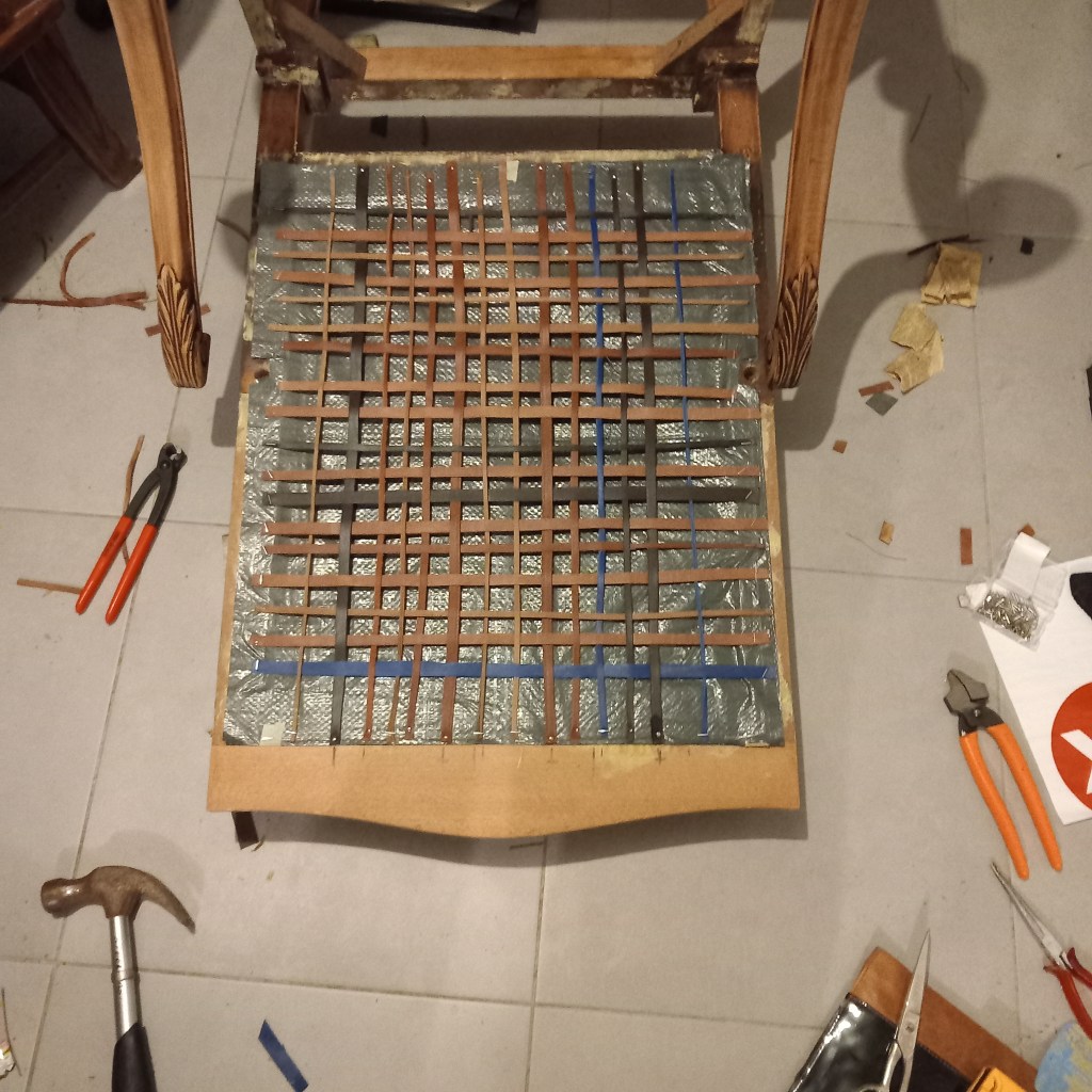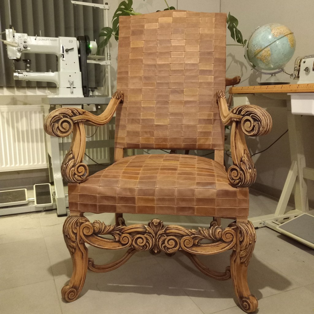 This was my grandmother her chair. By the time I took it in home, it had not been used for three years. Really allowing the smell to set in and ooze out. So keeping in it house in its original state was not an option. In one of the pictures it show staples of squares, leftovers from my pencil cases. I save all my rest pieces and I had quite a few from the Arizona line. So I just started stripping it bare to find straw, jute and copper springs. The smell was horrible and very dusty. After removing all nails, I used wood fill and sanding paper to clean up. The back is made up of cuts from straps and my favorite sweaters. Most of them I have worn till literally falling apart. So I cut them up even more and glued them all together with white glue I don’t plan on using anymore before it is rock solid. for the seating I tried my best to use the copping springs, but couldn’t make it work. So just opted to use wood from my old desk as bottom, filled with a layer of split leather, which was kind of hard to sit on. So bought two of the cheapest pillows I could find and add that filling to it. The backside is still not finished, I played with the idea of using other leather or some fabric. But decided against it and just going to wait until I have enough Arizona leftovers. Made this chair in about 115 hours, in 3 weeks. Loved every second of it, but this was my first and most likely last chair. It’s my grandma’s chair.