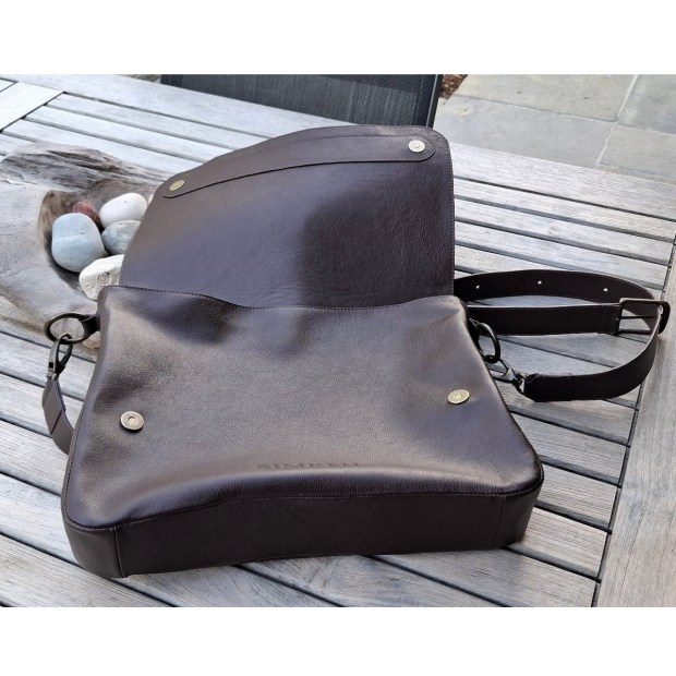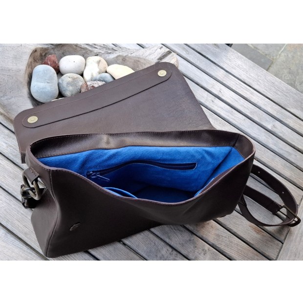 I learned from #071 that my inner ring had to be more sturdier for a move natural wave. So I fixed that with an extra strap of cows leather. Not super happy about the visible magnet outline. Kind of new this was going to be a problem. Could only use magnets because it was all I had in my drawer that made sense, but I wanted the flap pressed instead of loose. Took a gamble, learned a lesson. Really love making this bag, the hardest part is finding suitable locks. But as soon as I found one, I am making another one.