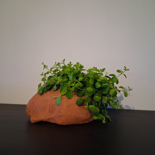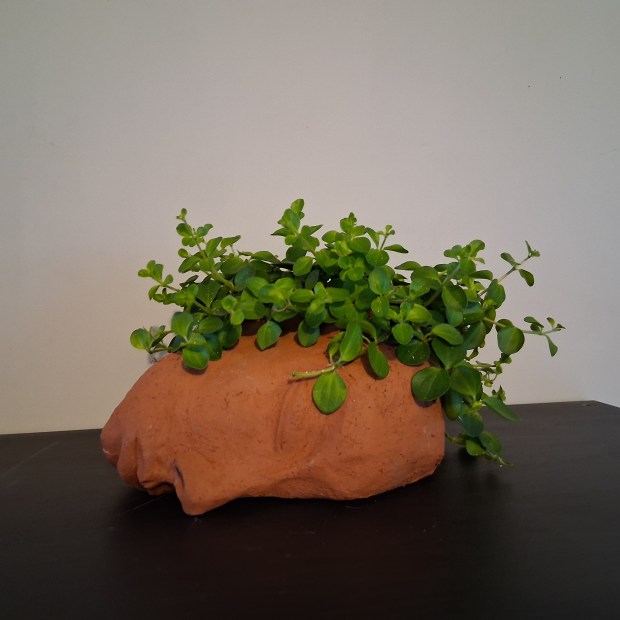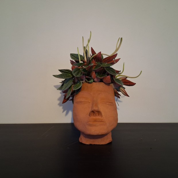 Medusa, Minotaur, Sisyphus, Atlas,.. all stories told by a teacher when I was 13. Best hour, every week. hands down. It has long been an idea to get a Medusa tattoo, but I don’t know. Does not feel right as a tattoo so it never got real. But as a flowerpot with a cactus that emulates snakes. My fingers get green at the thought. My first try was the normal head. The second was the one with the snake around the neck. I am already in love with the baby cacti, in two or three years it is going to be mind blowing. The half head was to complete the idea of ‘Medusa through time’. If the oven gods grace me again with success I have one more addition to the piece. But it is still drying out so stay tuned I guess.