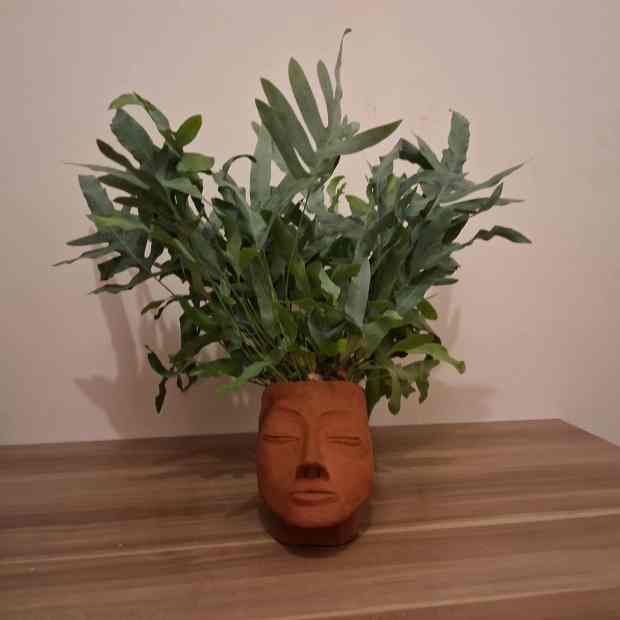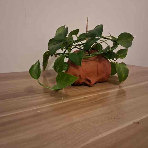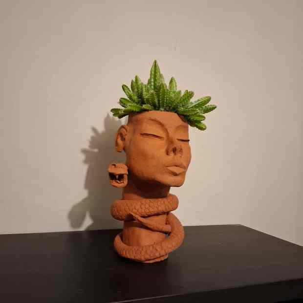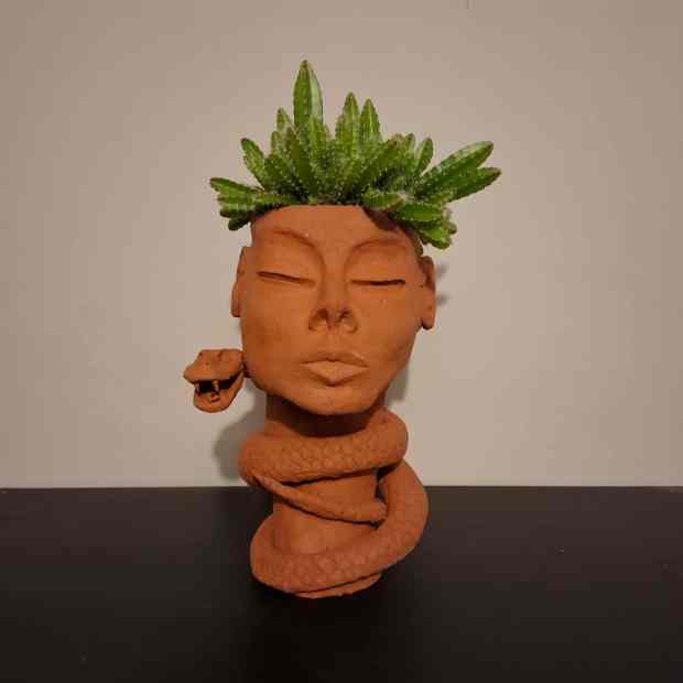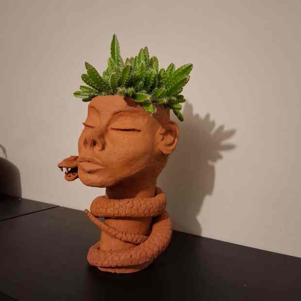 Medusa, Minotaur, Sisyphus, Atlas,.. all stories told by a teacher when I was 13. Best hour, every week. hands down. It has long been an idea to get a Medusa tattoo, but I don’t know. Does not feel right as a tattoo so it never got real. But as a flowerpot with a cactus that emulates snakes. My fingers get green at the thought. My first try was the normal head. The second was the one with the snake around the neck. I am already in love with the baby cacti, in two or three years it is going to be mind blowing. The half head was to complete the idea of ‘Medusa through time’. If the oven gods grace me again with success I have one more addition to the piece. But it is still drying out so stay tuned I guess.