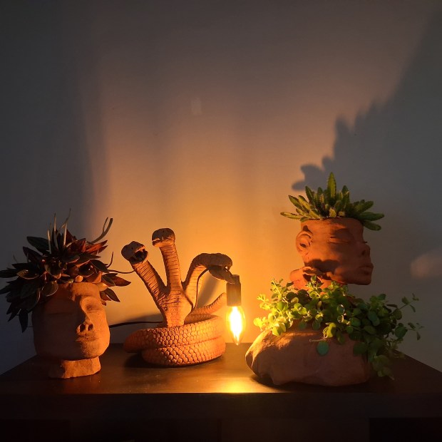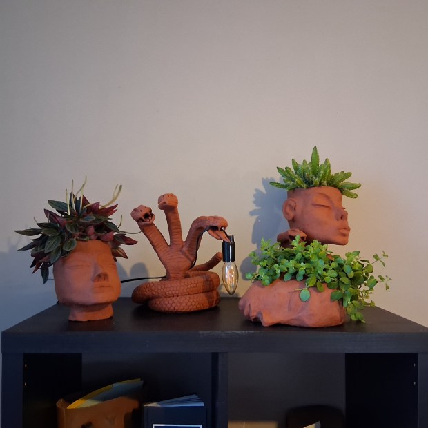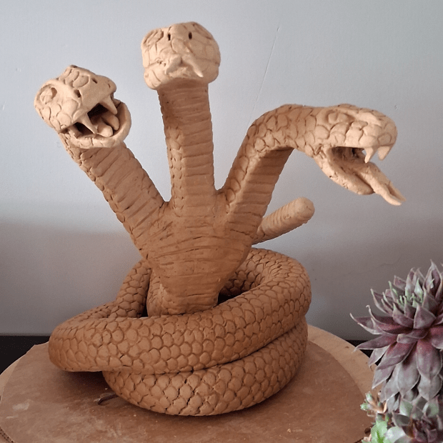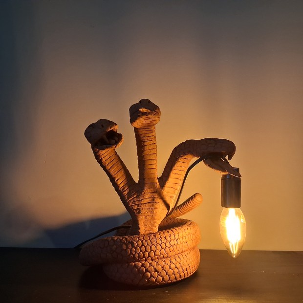 The Idea kept being stuck in my head. Some animal holding a lamp in its mouth. Settled on a three-headed snake. Mythology suffices as a reason. I just felt I couldn’t let this one go without giving it a shot. I forgot to make it a bit bigger to compensate for the shrinking in the oven which was more than I anticipated. But it is good enough for a spot in my workshop. Back to leather now.